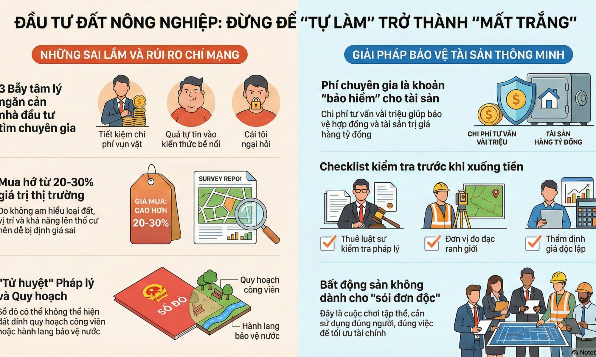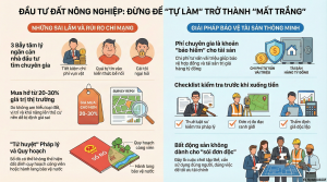 Rất nhiều người khi đầu tư đất nông nghiệp mắc sai lầm tự làm tất cả mọi thứ với suy nghĩ tiết kiệm chi phí và chủ động kiểm soát. Sáu Bình phân tích sâu sai lầm này, chỉ ra nguyên nhân, hậu quả thực tế và vì sao việc không nhờ chuyên gia có thể khiến nhà đầu tư trả giá đắt bằng tiền, thời gian và cơ hội. Bài viết giúp Bạn hiểu đúng vai trò của chuyên gia khi đầu tư đất nông nghiệp để đi đường dài an toàn hơn.